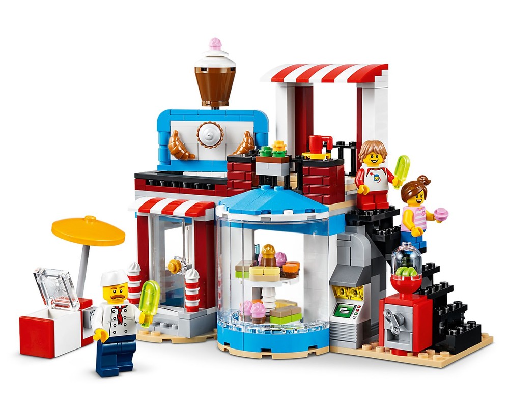 - Enthält eine baubare LEGO Konditorei mit farbenfroher Fassade, großem Erkerfenster, drehbarem Tortenständer, 3 rot-weiß gestreiften Markisen, Dachterrasse mit Sitzecke, ein mit Kuchen und Gebäck verziertes Schild, einen Geldautomaten, einen Verkaufsstand, einen Kaugummiautomaten sowie als Blume und Cupcake verzierte Steine.