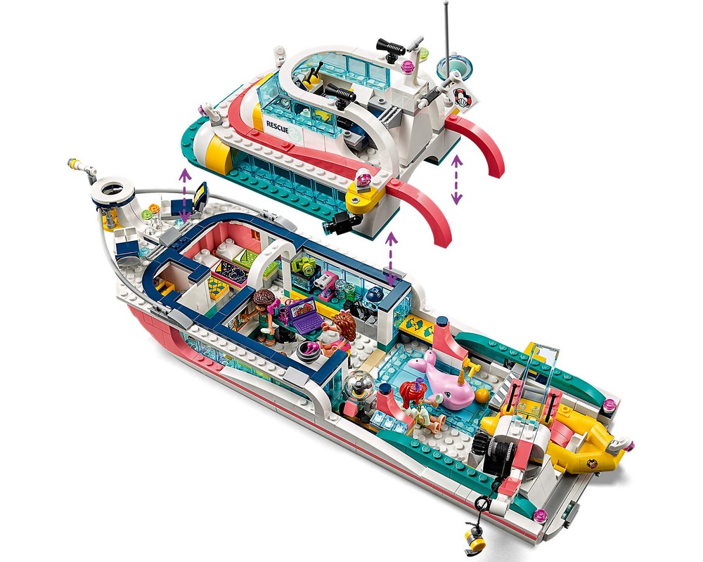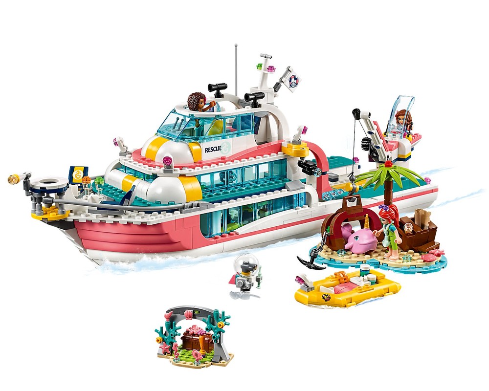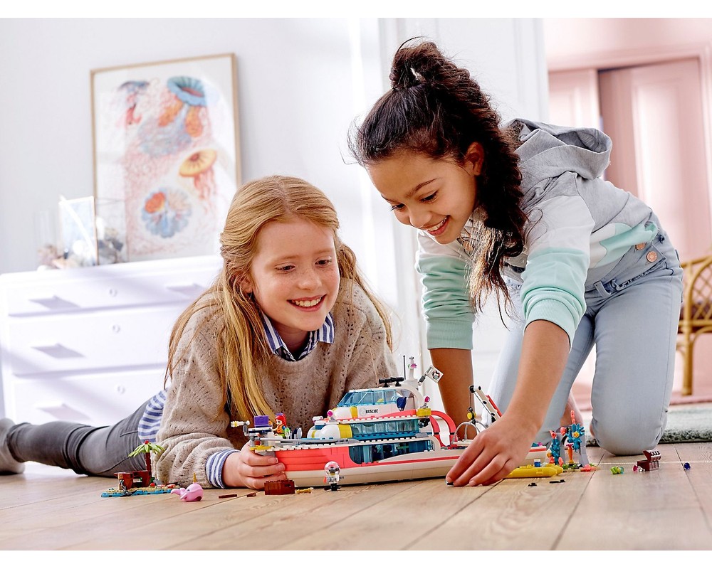 Kinder erleben mit dem kreativen LEGO Friends Set „Boot für Rettungsaktionen“ (41381) stundenlange Tierrettungs-Spannung. Mit diesem umfassend ausgerüsteten Spielzeugboot können Kinder zahlreiche Tierrettungs-Szenarien nachspielen. Es gibt eine Schnellbootbucht mit Startfunktion, einen Schwenkkran mit Trage für den Transport von kranken Tieren, eine Aussichtsposition und einen Cockpitbereich. Das Deck lässt sich entfernen, um die Kabine zu erreichen, die ein Labor, eine Küche und ein Schlafzimmer mit Toilette umfasst. Für noch mehr Spielmöglichkeiten ist eine separate, herzförmige Insel vorhanden, die eine versteckte, mit Wasser reagierende Stoff-Schatzkarte birgt. Diese enthüllt den Ort, an dem sich der Unterwasserschatz befindet.