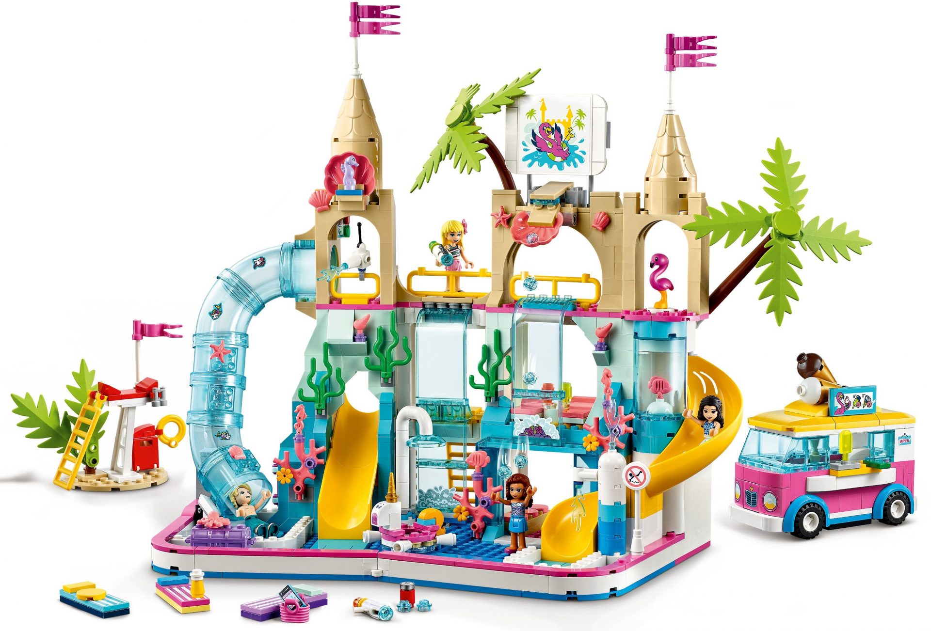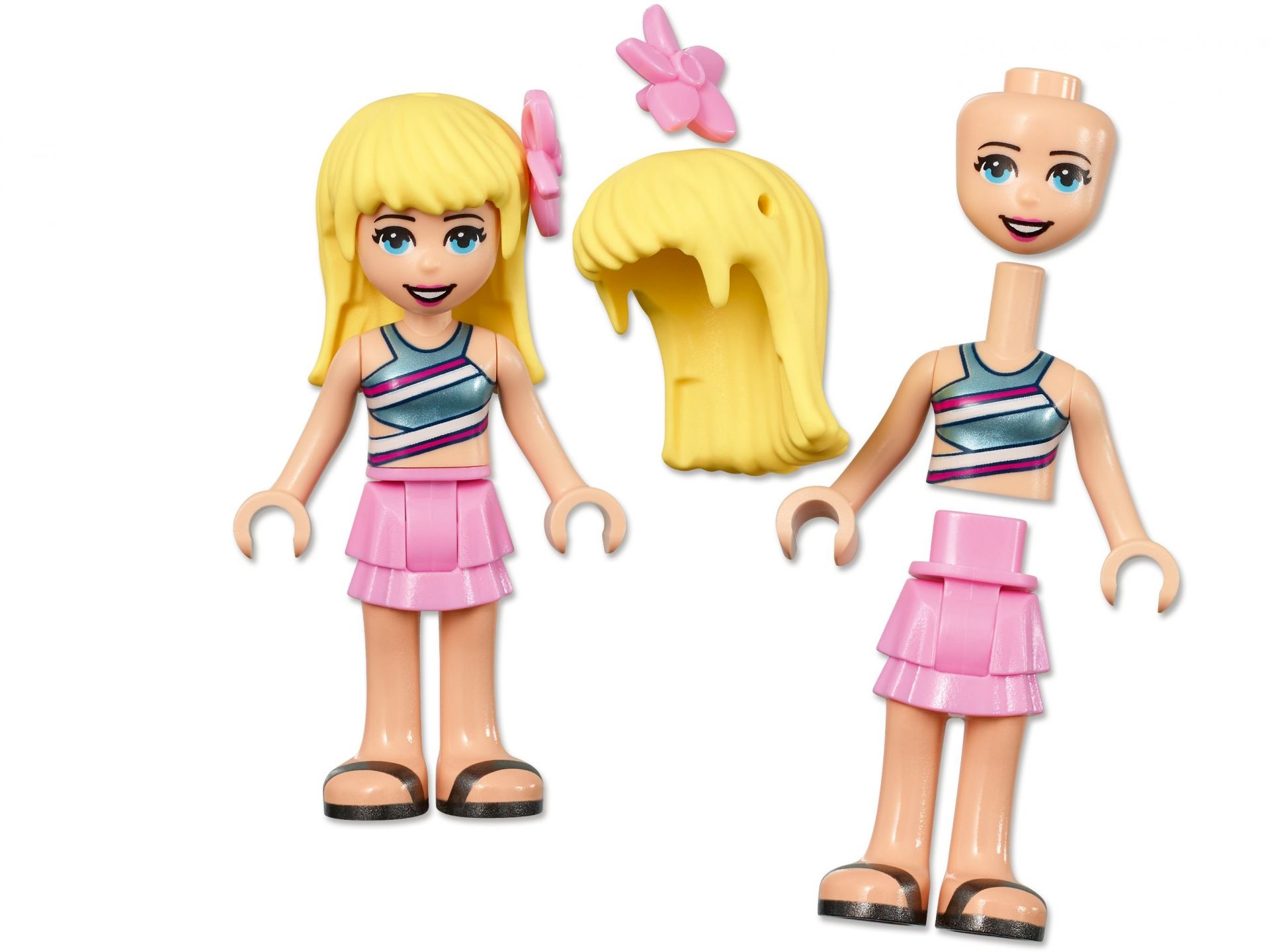 - Mit dabei sind auch die LEGO Friends Heldinnen Stephanie, Emma und Olivia als baubare Spielfiguren sowie Mason als Badeaufsicht. Die Flamingofigur Pinky verleiht dem Set einen zusätzlichen Farbtupfer.