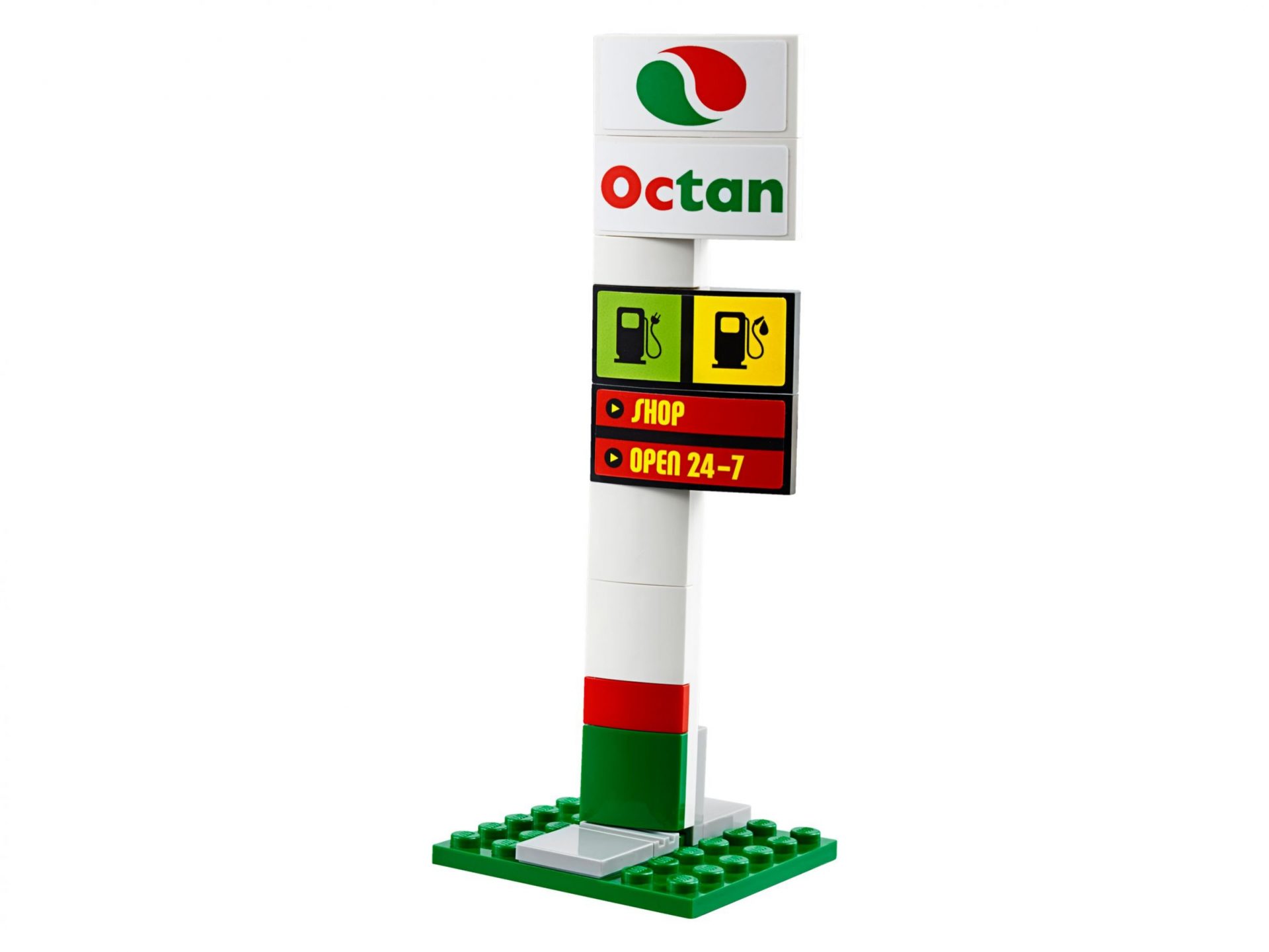 - Enthält ein eingeschossiges Gebäude mit 2 verschiedenen Bauanleitungen für eine Tankstelle mit Schild, Zapfsäulen und Kiosk oder eine Werkstatt mit Hebebühne, Postschalter und separater Waschstation.