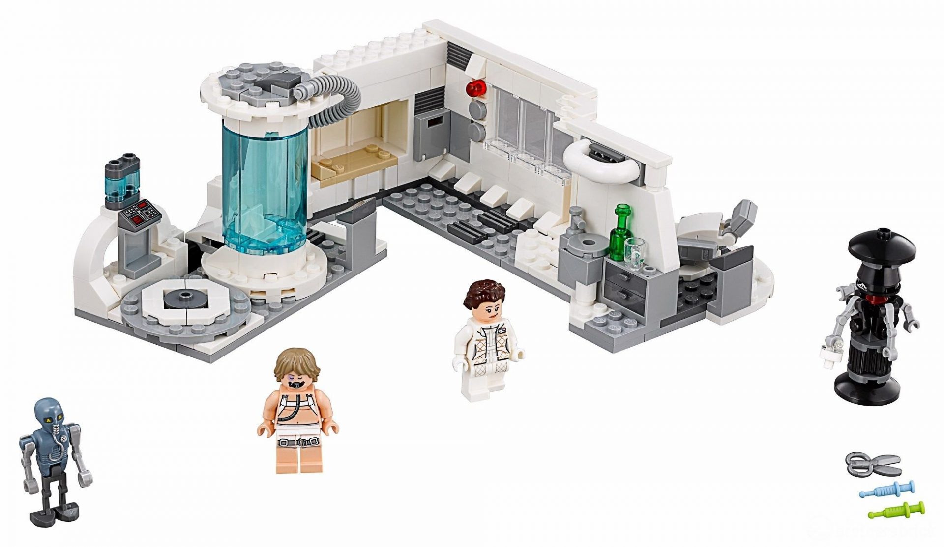 • Enthält einen aufklappbaren Bacta-Tank, in den eine Minifigur hineinpasst, den drehbaren Medizindroiden FX-7, einen drehbaren Untersuchungsstuhl, ein Bett, eine Waschstation und Schubladen.