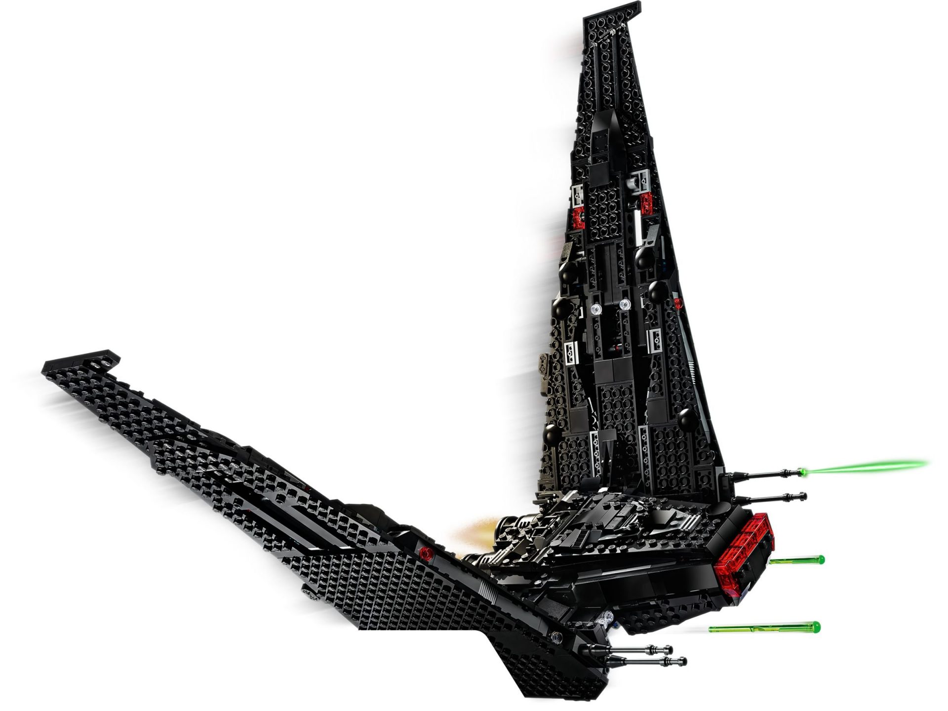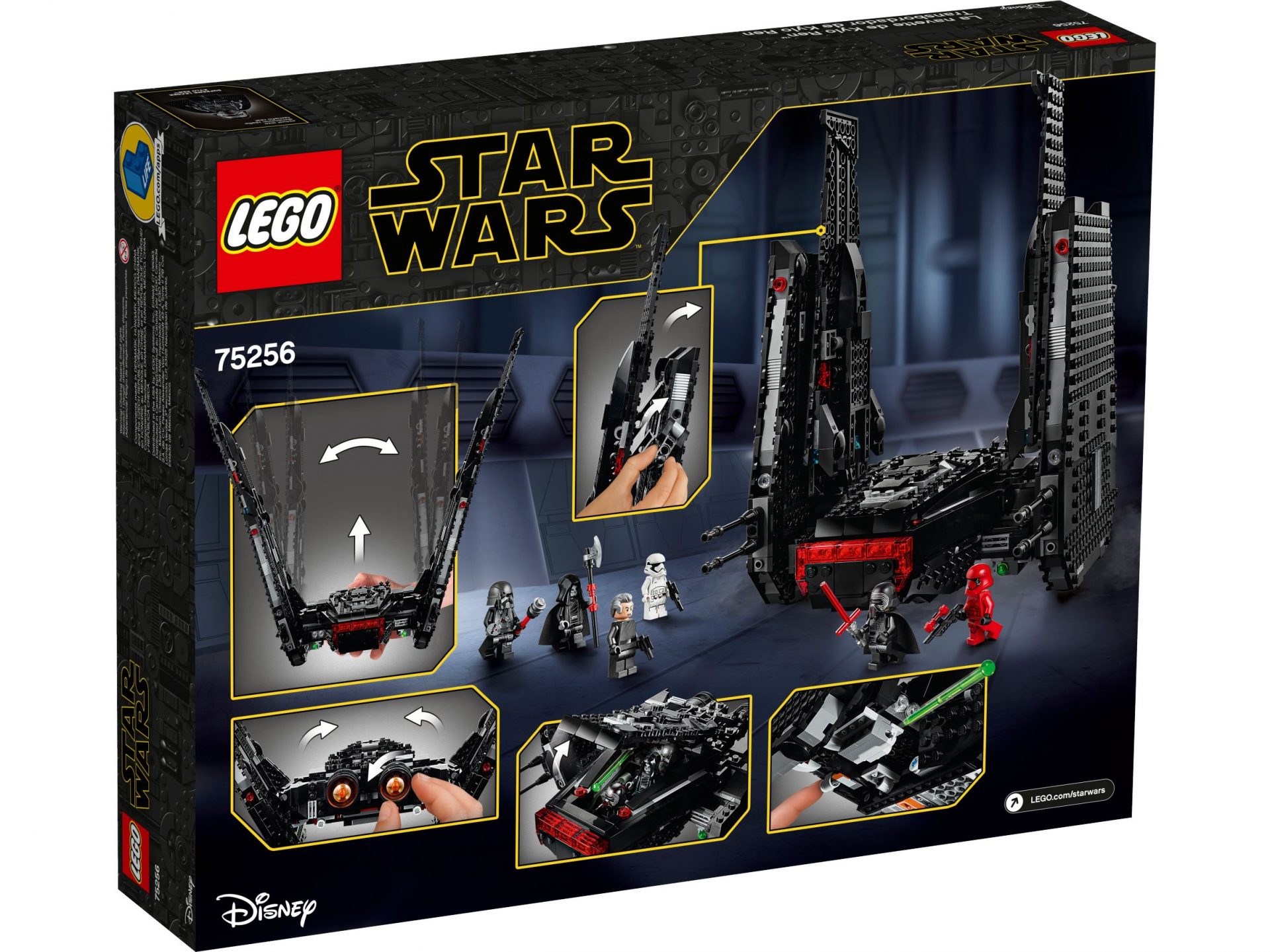 - Kylo Rens Kommandoshuttle verfügt auf der rechten Seite über einen drehbaren Motor mit dem die Flügel bei der Landung eingeklappt werden können und die Möglichkeit, die Flügel durch Herunterklappen des oberen Teils zu verkürzen. Darüber hinaus gibt es 2 Shooter mit Federmechanismus, eine absenkbare Zugangsrampe und ein Cockpit für 3 Minifiguren.